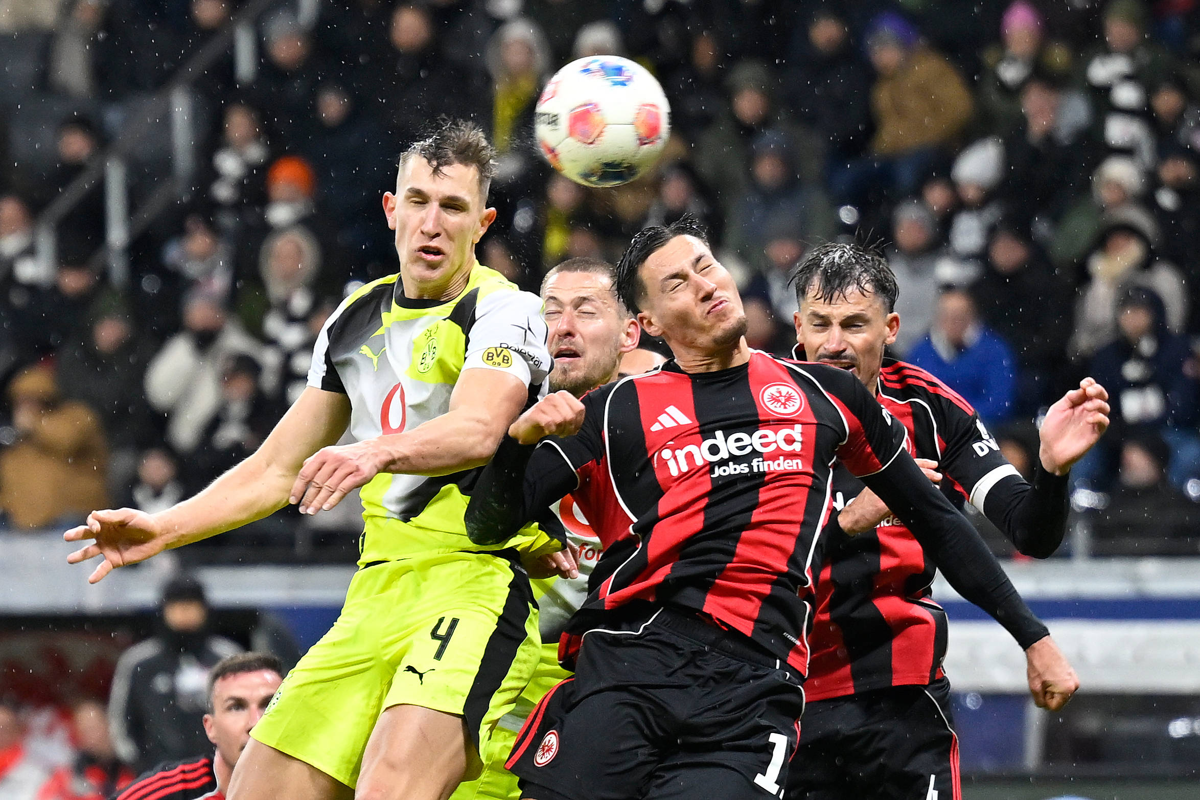 1月9日,法兰克福队球员埃布努塔利布(前右)和多特蒙德队球员施洛特贝克(前左)在比赛中争顶头球。 新华社发(乌尔里希·胡夫纳格尔 摄)